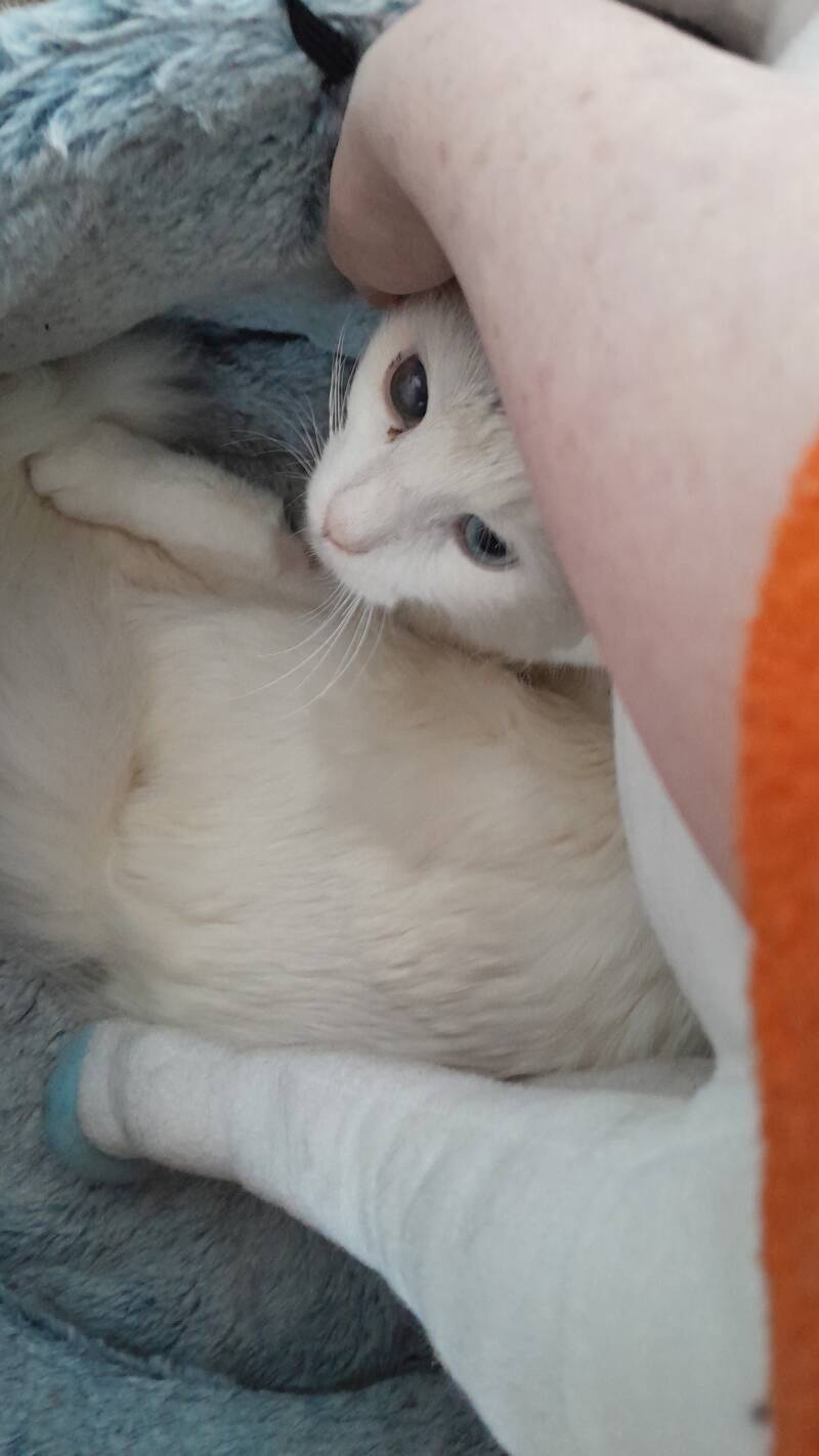 We kregen nog een zwerfkat afgeleverd, hoop meegemaakt. Kaak gebroken (door onze wereld-dierenarts weer netjes gerepareerd), de vacht van Kreukeltje is grijs van kleur, in plaats van wit, door het maandenlange buiten zwerven. Broodmager. Even terug om de krammetjes uit zijn kaak te halen. En zo boos als hij was op onze vrijwilligster, hij kroop toch maar vlug tegen haar aan, toen onze dierenarts met een tangetje aan kwam zetten om de krammetjes voorzichtig uit zijn onderkaak te halen.
